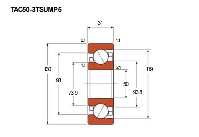 TAC50-3TSUMP5是一款超高精密丝杠轴承,属于TAC-3高承载系列产品。其基本尺寸设计为内径50毫米、外径130毫米、厚度31毫米,结构紧凑且具备良好的空间适配性。该轴承采用优化的滚道轮廓与多点接触设计,在有限尺寸下提升了径向和轴向的载荷分布能力,有助于缓解局部应力集中现象。