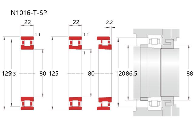 N1016-T-SP型轴承属于超高精密圆柱滚子轴承系列,其结构为N型设计,采用单列圆柱滚子且外圈无挡边。这种结构使该轴承具备轴向位移适应能力,适用于存在轴与座孔相对热膨胀的工况。该型号内圈带有两个固定挡边,可引导滚子保持稳定运动轨迹。