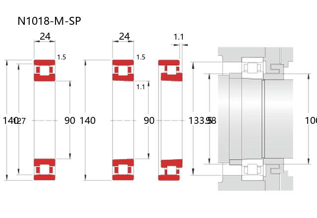 N1018-M-SP属于超高精密轴承类别下的N型精密圆柱滚子轴承系列。该型号的内圈两侧带有固定挡边,外圈无挡边结构,使其具备良好的轴向位移适应能力,适用于需调整轴向游隙的工况环境。