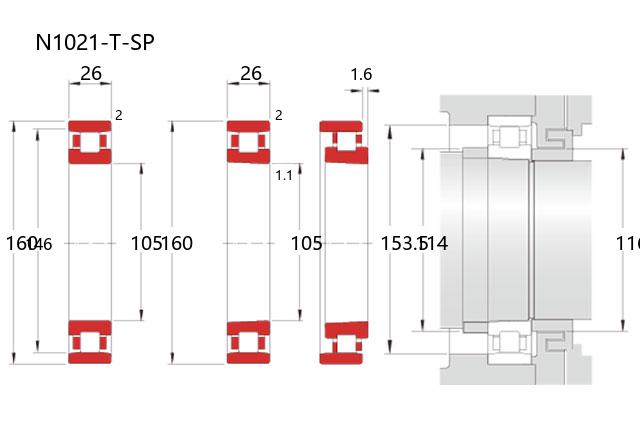 N1021-T-SP属于超高精密轴承类别下的精密圆柱滚子轴承系列,具体为N型结构设计。该型号轴承的基本尺寸为内径105毫米、外径160毫米、厚度26毫米,换算为英制单位约等于内径4.1339英寸、外径6.2992英寸、厚度1.0236英寸。这类轴承的构造特点在于外圈两侧带有固定挡边,内圈则为可分离形式,便于安装与维护操作。