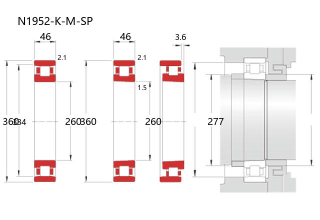N1952-K-M-SP属于超高精密圆柱滚子轴承系列中的N型结构,适用于需要高旋转精度和刚性支撑的工况。该型号轴承内径为260毫米,外径为360毫米,厚度为46毫米,尺寸设计兼顾了承载能力与结构紧凑性。
