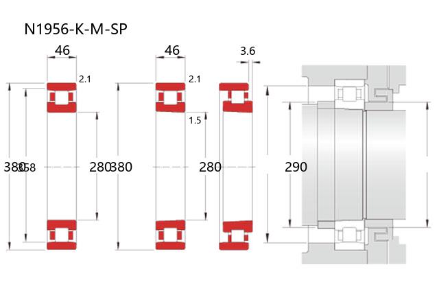 N1956-K-M-SP属于超高精密圆柱滚子轴承中的N型结构。这类轴承通常具备优化的内部几何设计,能够适应高速运转和中等以上径向负荷的工作条件。其基本尺寸为内径280毫米、外径380毫米、厚度46毫米,适用于对安装空间有特定要求的重型设备或高精度机械装置。