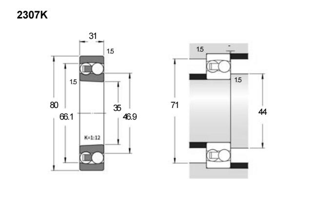 2307K型轴承属于调心球轴承系列,其设计特点为锥孔开式结构。该轴承的基本尺寸为内径35毫米、外径80毫米、厚度31毫米,适用于需要一定角度调整能力的安装环境。锥孔设计便于通过紧定套实现与轴的紧密配合,简化了安装和拆卸过程。