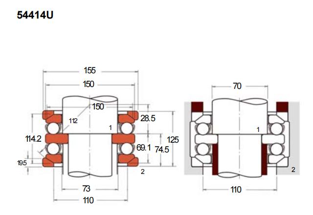 基本尺寸:内径:70 mm,外径:150 mm,厚度:107 mm。