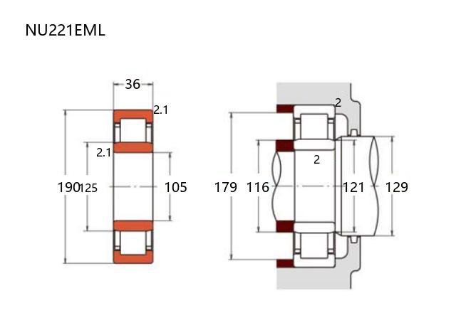 NU221EML属于单列圆柱滚子轴承中的NU型结构,内圈两侧带有固定挡边,外圈无挡边设计,使滚子与内圈具备轴向位移能力。该型号内径为105毫米,外径190毫米,厚度36毫米,尺寸精度符合标准工业规范。其内外圈与滚子组件经优化设计,可适应径向负载为主的工况,尤其适合承受中高速旋转状态下的重载条件。