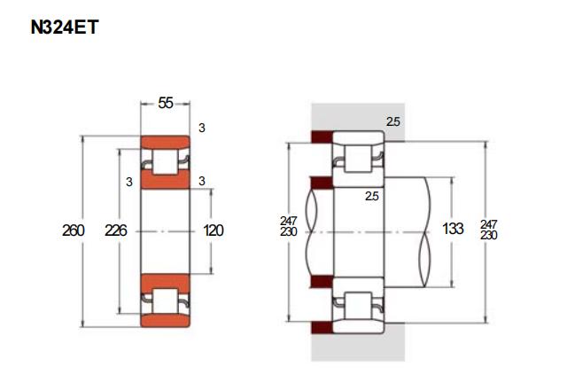 N324ET轴承属于单列圆柱滚子轴承N型结构,其内圈设有两个固定挡边,外圈无挡边设计,适用于轴与外壳孔之间的轴向位移补偿。该型号的具体基本尺寸为内径120毫米、外径260毫米、厚度55毫米,换算为英制尺寸分别约为4.7244英寸、10.2362英寸和2.1654英寸。