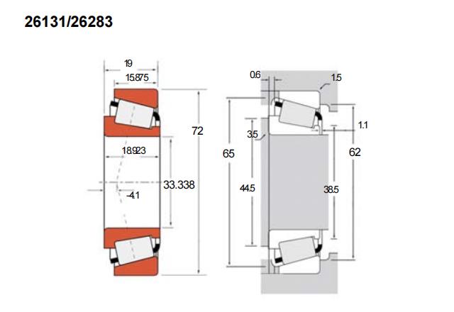 26131/26283属于TS系列单列英制圆锥滚子轴承,其基本尺寸为内径约33.338毫米(折合英制尺寸约1.313英寸),外径72毫米,厚度19毫米。这类轴承采用圆锥滚道与滚子设计,能够同时承受径向载荷与单向轴向载荷,适用于需承受联合载荷的工况。由于内外圈可分离,安装与调整相对便捷,便于维护。