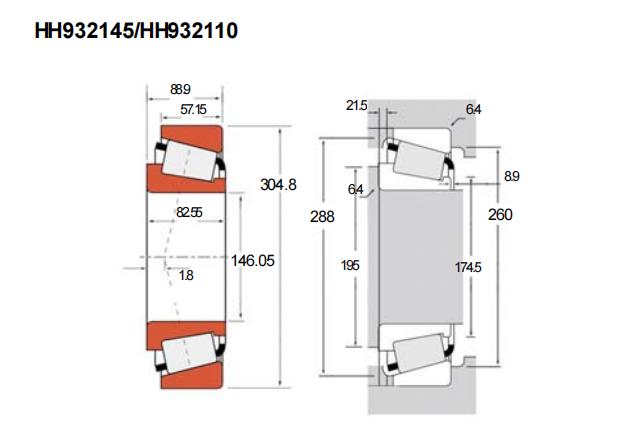 HH932145/HH932110是一款单列圆锥滚子轴承,属于英制TS系列。其基本尺寸为内径146.05毫米(约5.75英寸),外径304.8毫米(约12英寸),厚度88.9毫米(约3.5英寸)。该结构采用分离式设计,内圈与滚子、保持架组件可单独安装,为装配和维护提供一定便利。