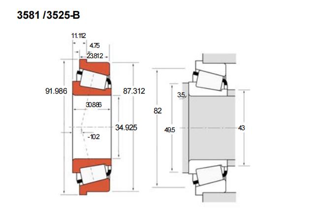3581/3525-B属于TSF系列法兰型圆锥滚子轴承,采用英制尺寸设计。其基本参数为:内径约34.925毫米(约合1.375英寸),外径约87.312毫米(约合3.4375英寸),厚度约30.886毫米(约合1.216英寸)。该轴承结构上包含法兰外圈,可简化轴向定位,适用于需要紧凑结构的安装场景。