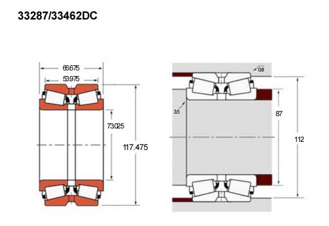 33287/33462DC属于TDO型双列圆锥滚子轴承,其结构特点为双列滚子呈对称分布,能够同时承受径向载荷与双向轴向载荷。该型号轴承的基本尺寸为内径73.025毫米,外径117.475毫米,厚度66.675毫米,折合英制尺寸约为内径2.875英寸、外径4.625英寸、厚度2.625英寸。此类轴承通过两列滚子与内外圈滚道的锥角配合实现较高的刚性,适用于存在复合载荷且需要限制轴系双向位移的工况。