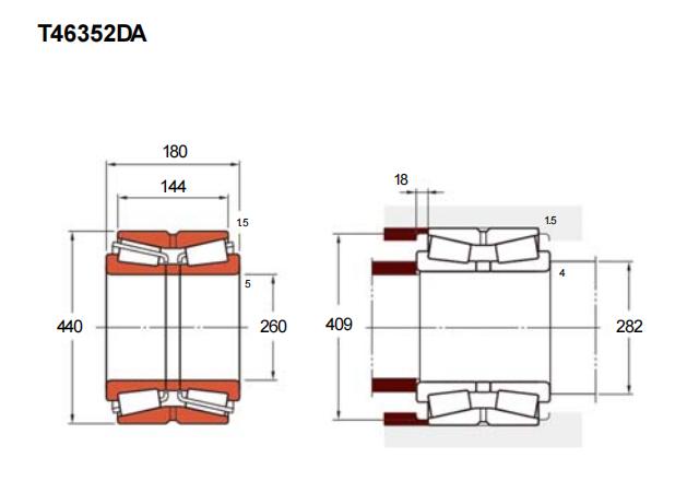 T46352DA型圆锥滚子轴承属于公制TDO双列结构设计,基本尺寸为内径260毫米、外径440毫米、厚度180毫米。该型号采用对称滚子与整体式保持架布局,能够同步承受径向载荷与双向轴向载荷,其双列结构较单列产品具备更高的倾覆刚度与力矩承载能力。
