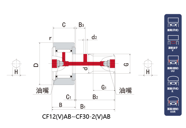 前缀列表:【CF:Cam Follower(螺栓滚轮/凸轮从动)轴承】后缀列表:【V:满装型】【UU:密封型,轴承两侧带橡胶密封圈】【AB:两端六角孔型】
