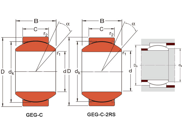 前缀列表:【G:关节轴承】【E:向心型】【G:内圈宽度等于孔径】后缀列表:【C:带自润滑型PTFE复合材料,可自润滑,免维护】【R:不锈钢型】