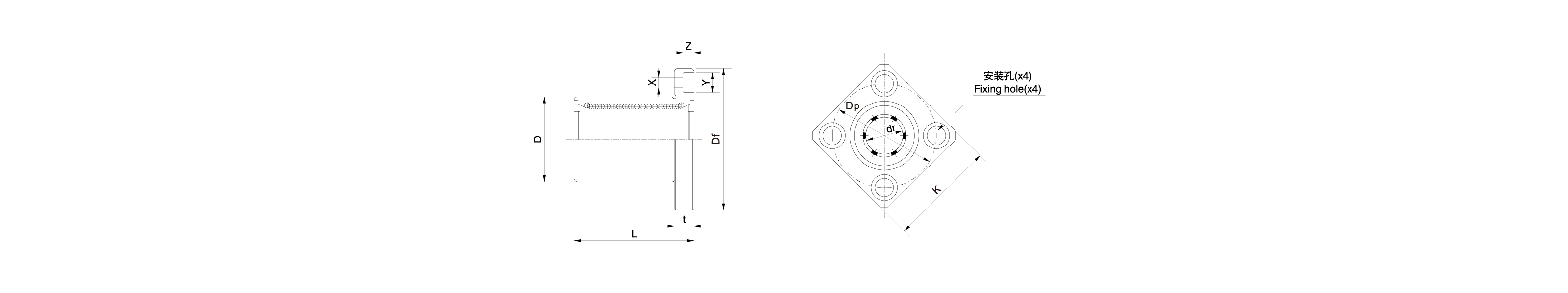 开式 | 密封型 | dr | D | L | Δdr | ΔD | ΔL | Df | K | t | P.C.D | X×Y×Z | |