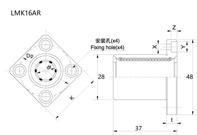 前缀列表:【LM:直线运动轴承】【K:方形法兰盘】后缀列表:【A:钢保持架】【R:低温黑铬工艺型】