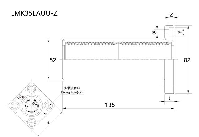 前缀列表:【LM:直线运动轴承】【K:方形法兰盘】后缀列表:【L:加长型】【A:钢保持架】【UU:密封型,轴承两侧带橡胶密封圈】【-Z:反向沉孔型】